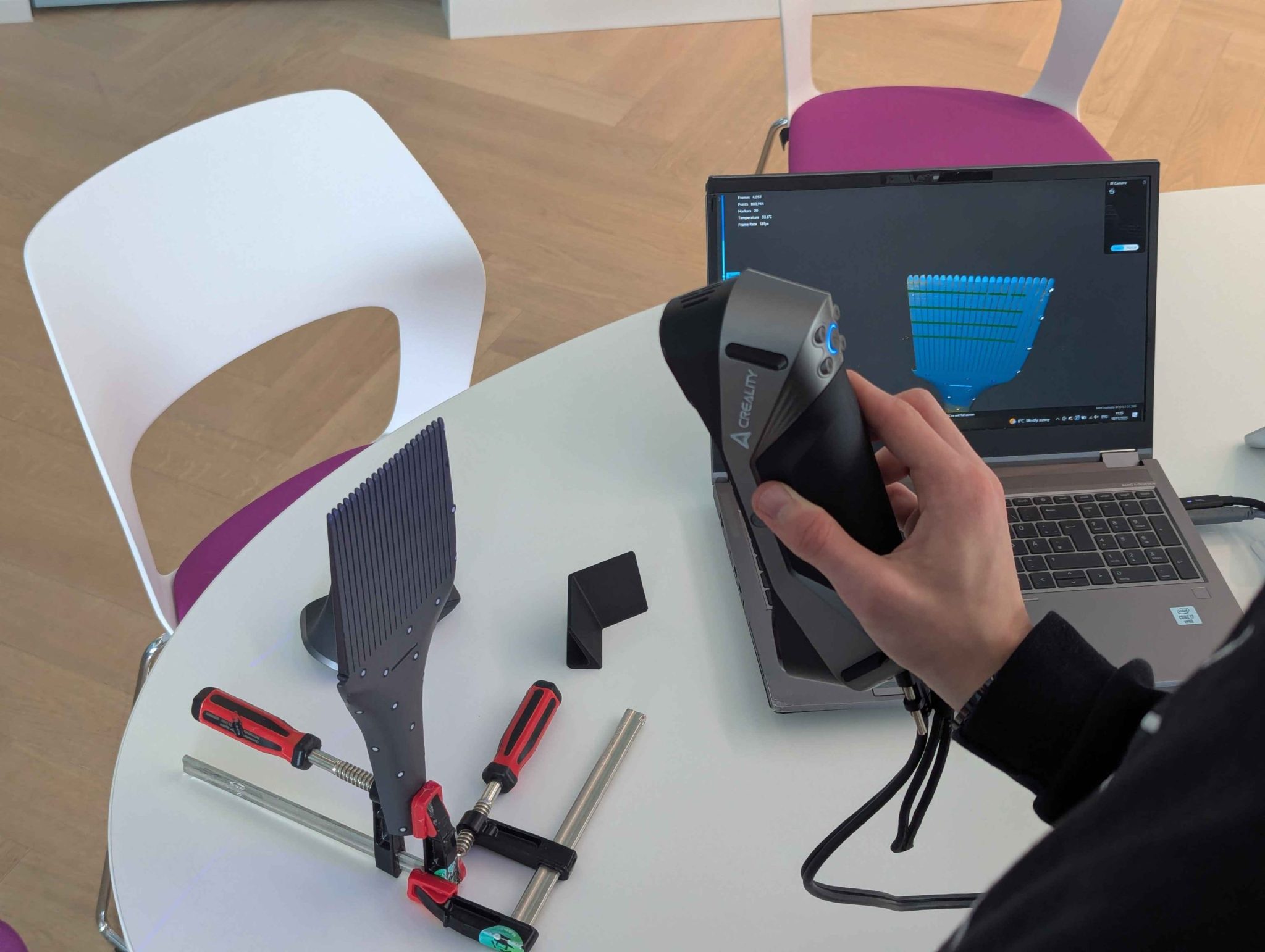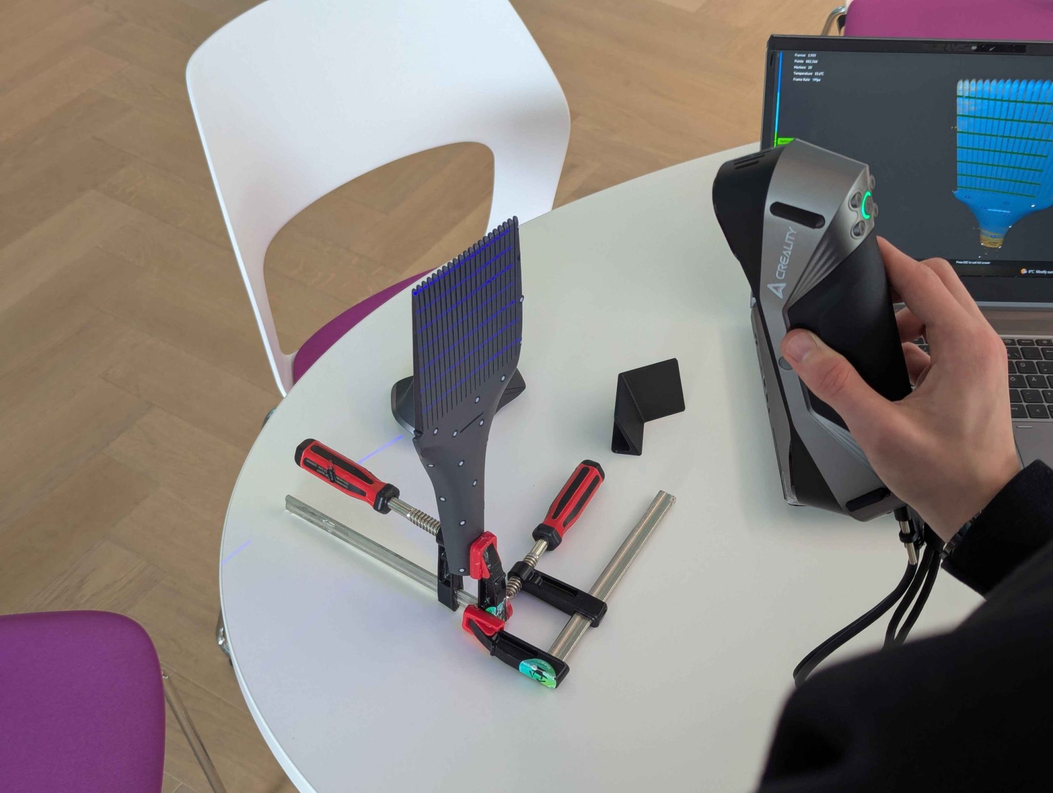 Danes smo zaključili z delavnico 3D skeniranja, ki se je je udeležilo 7 udeležencev. Zadali smo si nekaj izzivov oziroma praktičnih primerov, ki smo jih na koncu tudi uspešno poskenirali.