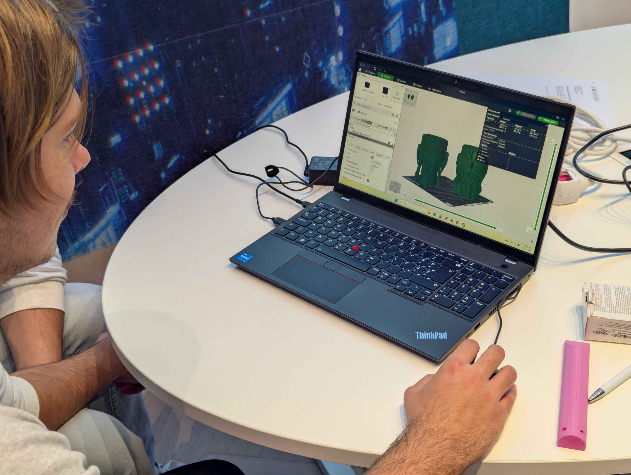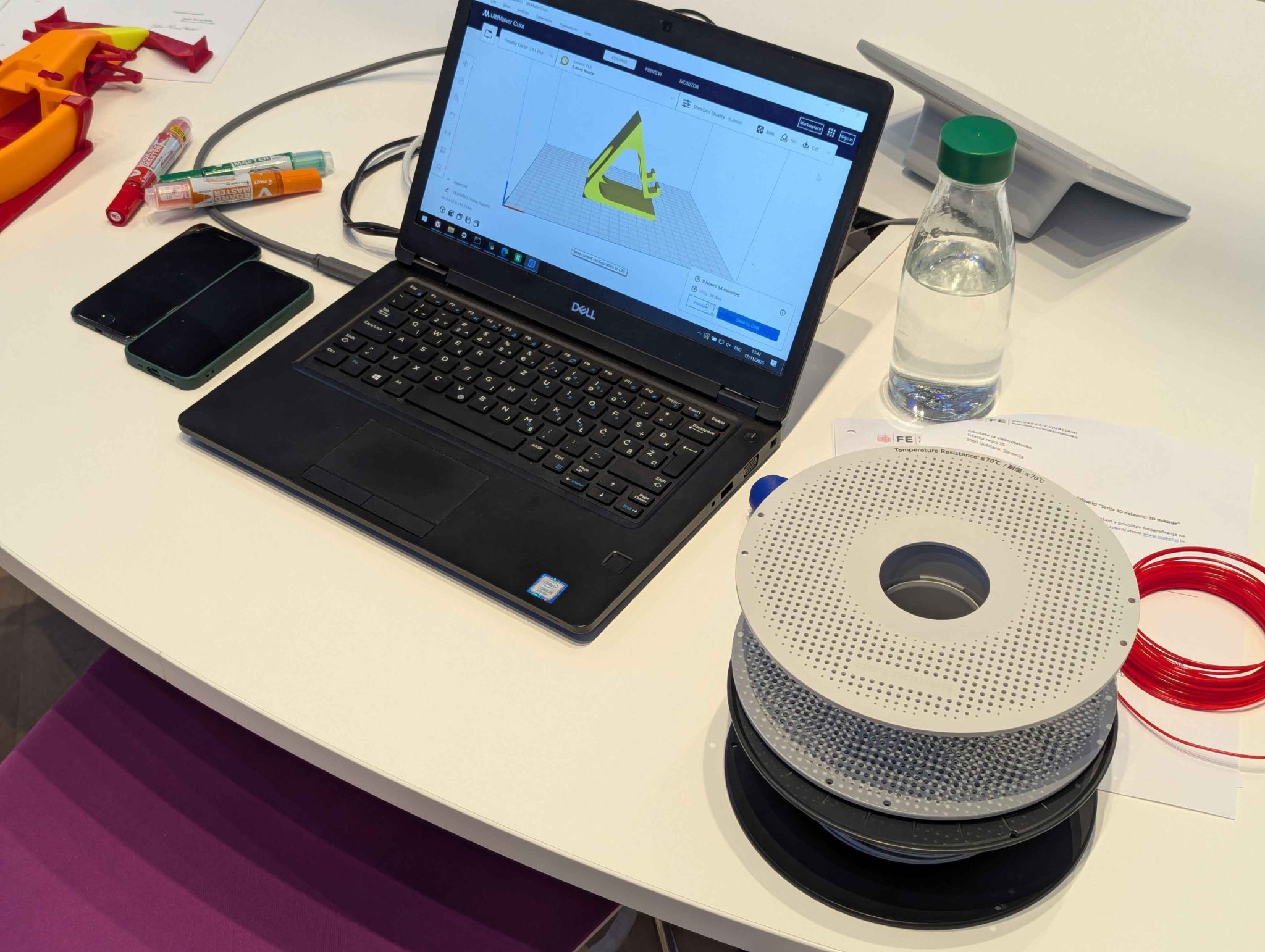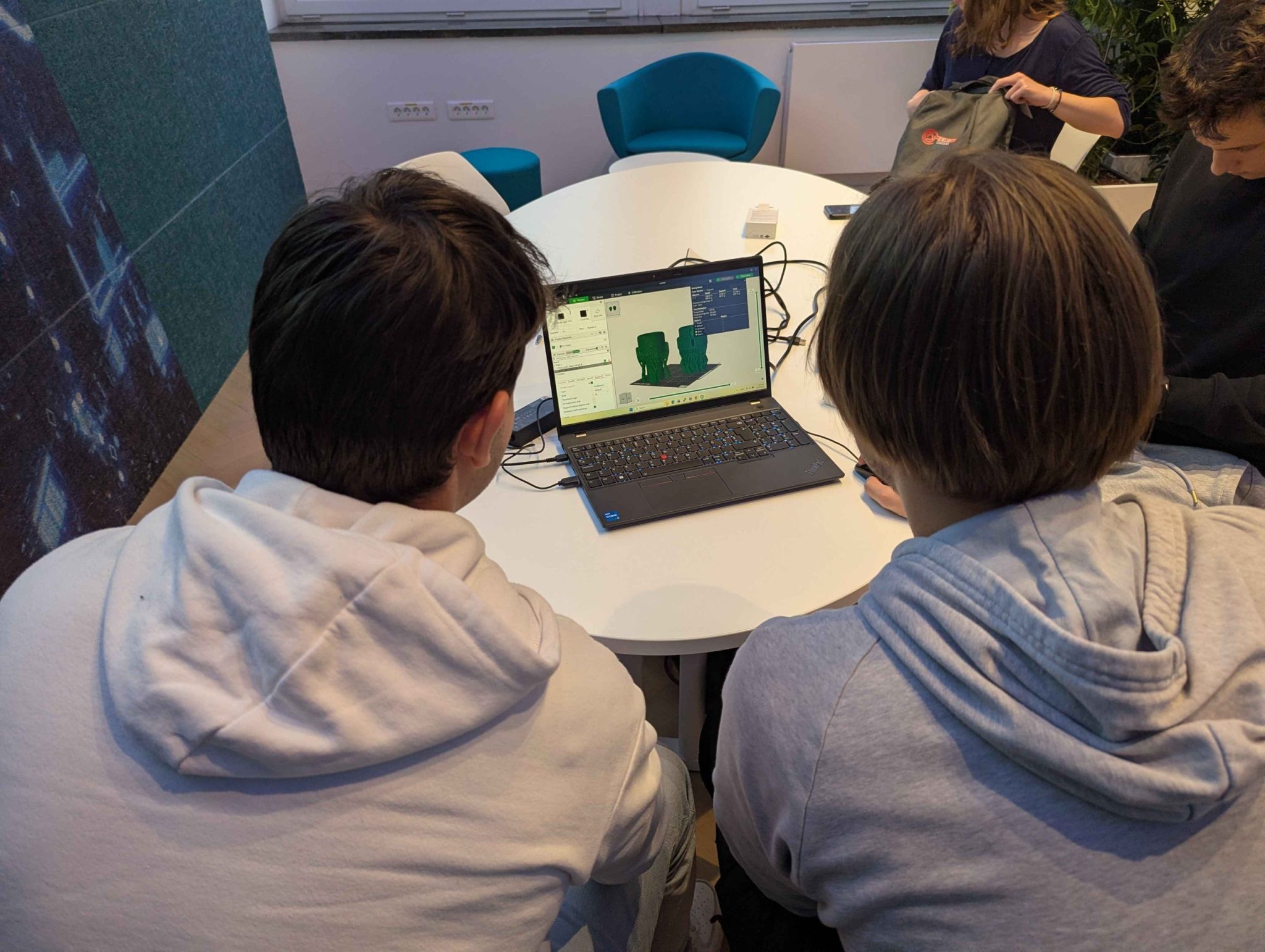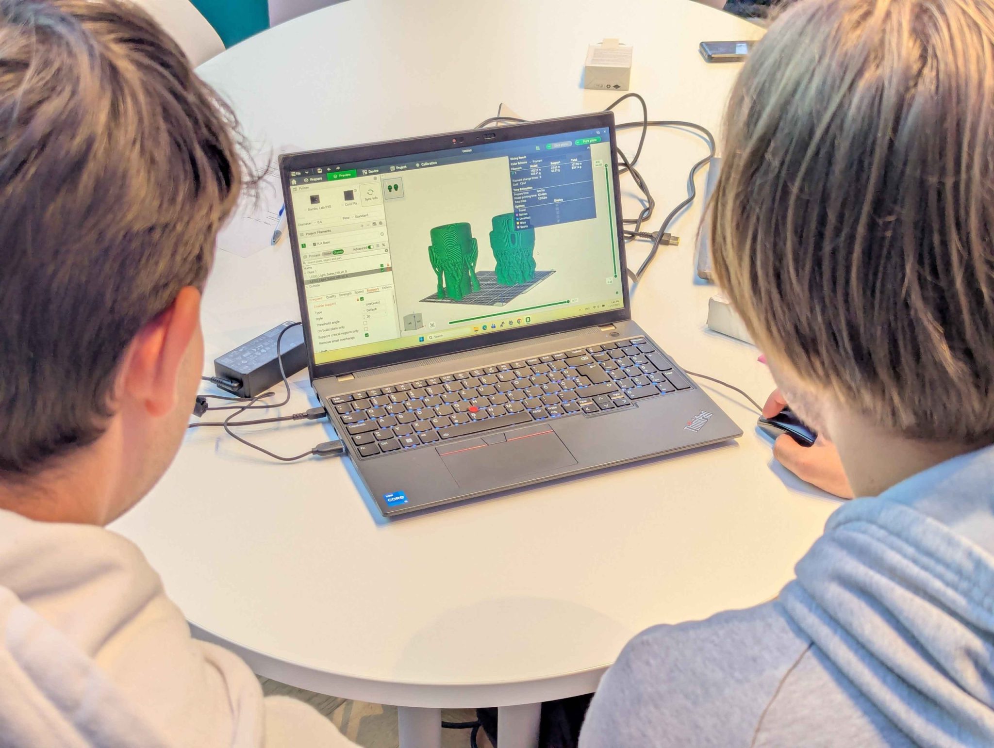 Študenti so se spoznali z različnimi programi (slicerji), ki nam omogočajo pretvorbo iz 3D modela v .gcode datoteko, ki jo razume 3D tiskalnik. Naučili smo se tudi, kako pravilno umestiti 3D model na delovno površino tiskalnika, da bo čas tiskanja čim krajši in poraba filamenta čim manjša.
